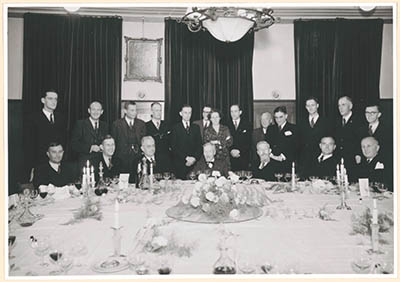 - Een groep Dordtse advocaten achter een feestdis. V.l.n.r. zittend: W.O. de Kat Angelino, G.Ch. Aalders, E.J.E.G. Vonkenberg, J.A.C.H.U. van Drooge, K.K. Douw van der Krap, J.A.W. Burger, G.J.W. van Tricht; staand: W.P. Bijleveld, D. Huurman, L. Salomonson, P.J. Sigmond, D.W.C. v.d. Velde, D.T. Henny, Mej. L.C.H. Dubois, B.A.M. Knüppe, F.G. Rens, P.L. v.d. Polder, J.G. van der Steenhoven, Z.J. de Langen, W. Beernink.