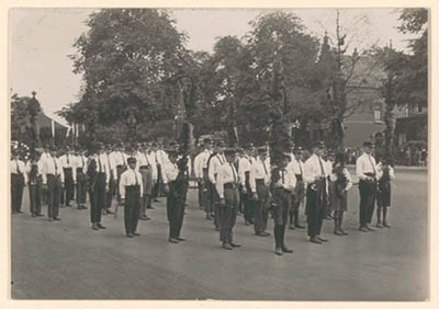 - Het tamboers- en pijpercorps Jubal aangetreden in het Oranjepark. Links de muziektent.