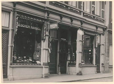 - Etalages van de handel in manufacturen en confectie van de Belgische Goederenhandel van A. van Loon aan de Voorstraat 5 en 7 (oud nr.).