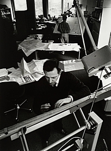 - De bouwkundige tekenkamer in het stadskantoor. Op de voorgrond Johan de Korte, projectleider van het tekenwerk van de restauratie en verbouwing van schouwburg Kunstmin.