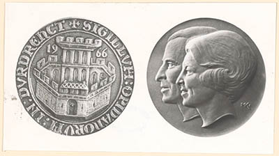 - Voor- en achterzijde van een penning, geslagen ter gelegenheid van het huwelijk van prinses Beatrix en prins Claus op 10 maart 1966: op de ene kant het grootzegel van Dordrecht uit 1339 met het jaartal 1966, op de andere de beeltenissen in reliëf van Beatrix en Claus, naar links met rechtsonder MK.