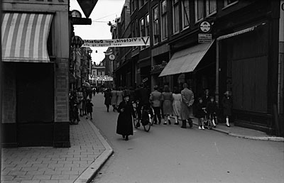 - De Voorstraat vanaf de Kolfstraat richting Nieuwstraat. De spandoeken maken reclame voor de Duitse bezetters.