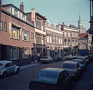 - De Wijnstraat gezien in de richting van het Groothoofd, met zicht op de Groothoofdstoren, aan de linkerkant huizen in verschillende soorten bouwstijlen.