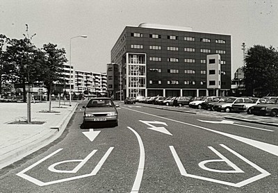 - Bewegwijzering op de Van Godewijckstraat richting parkeergarage en Beverwijcksplein. In het gebouw zit de ANWB. De flats staan aan de Spuiboulevard met ernaast het bankgebouw van de ABN-Amro