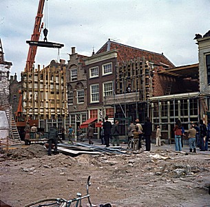 - Nieuwsgierig publiek bij de gevel-verplaatsingen in de Nieuwstraat, de gevels zijn afkomstig van gesloopte panden aan de overkant van de Nieuwstraat; links naast de 'renovatie-panden' de winkel Busnach Foto en Film en links daarvan huis het 'Napolitaensche Peerdt'.