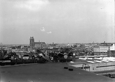 - Panorama vanaf de heftoren van de Dokbrug in noordoostelijke richting. V.l.n.r. de Kalkhaven, de Grote Kerk, het Achterhakkers en de fabrieken EMF en Victoria.