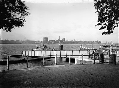 - De steiger in Papendrecht voor de veerdienst op Dordrecht over de Merwede. In Dordrecht staat de gashouder aan de Bleijenhoek, rechts daarvan de gasfabriek aan de Merwekade. Rechts op de foto het Groothoofd.