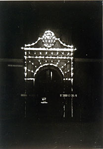 - Verlichte toegangspoort van de Arend Maartenshof in de museumstraat t.g.v. het koninklijk bezoek bij de opening van de zeehaven.