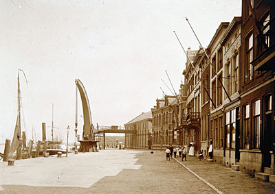 - De Merwekade in oostelijke richting. De hijskraan staat voor de kolenlaadbrug bij de gasfabriek. Rechts staan de cafés Merwestroom en Rijnvaart.