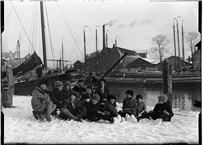 - bruggen dukdalven / meerpalen fabrieken havens kinderen sneeuw zeilvaartuigen