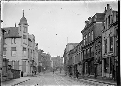 - Het Bagijnhof op de voorgrond, de Visstraat in het verlengde. De eerste straat links de Bagijnestraat met de Middenstandsbank annex D.M.I. melksalon. De tweede straat links is de Lange Breestraat. De Korte Breestraat ligt er rechts tegenover.