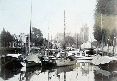 - De Nieuwe Haven in de richting van de Lange IJzerenbrug en de Grote Kerk. De huizen links staan in het verlengde van de brug in de Vleeshouwersstraat.