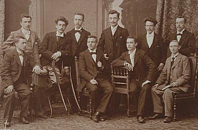 Groepsportret van de oprichters van het toneelgezelschap Inter Amicos