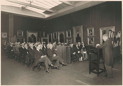 - Burgemeester Bleeker opent de historische Prentententoonstelling (Oranjetentoonstelling) in het Dordrechts Museum t.g.v. het 40-jarig regeringsjubileum van H.M. Koning Wilhelmina. 1e rij van links Jhr. Six (conservator), daarnaast: Mr. Blussé van Alblas, achter deze: wethouders Van Huiden en Dicke; rechts: Mussert, achter hem de secretaris Mr. K.J. Poll.