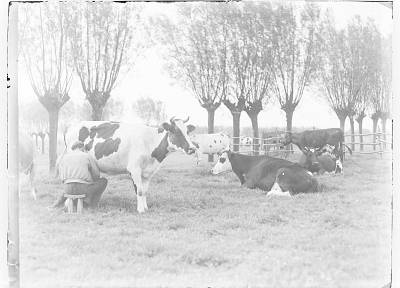 - Melkende boer voor Albers Creameries Limited, kunstboterfabriek in een weiland in Sliedrecht
