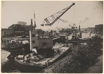 - Overslag van goederen tussen een coaster en een binnenvaartschip met twee drijvende spilkranen in de Kalkhaven. Gezien vanaf Achterhakkers in noordelijke richting links de Binnen Kalkhaven.
