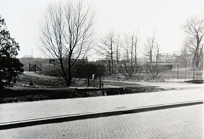 - Vanaf de Krispijnseweg had men via een hek toegang tot de Watermolenweide. Rechts op de achtergrond de vroegere fabriek van Lips en de voetgangersbrug over de spoorlijn.