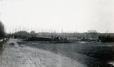 - Gezicht op de Watermolenweide gaande langs de bocht in de richting van de Weeskinderendijk. Grondwerkers zijn bezig het terrein voor bebouwing voor te bereiden.
