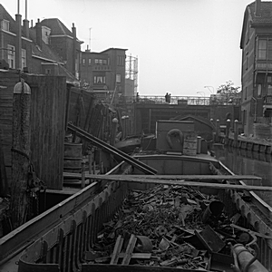 - Deze foto is genomen net nadat de hefboom van de brug was verwijderd. Op de achtergrond zie je de gashouder aan de Riedijkshaven