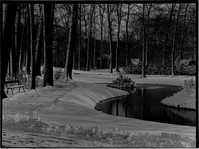 - Een besneeuwd park Merwestein; op de achtergrond de Groenedijk
