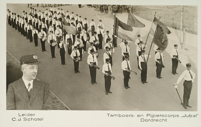 - Tamboers- en Pijperskorps Jubal en de leider C.J. Schotel.
