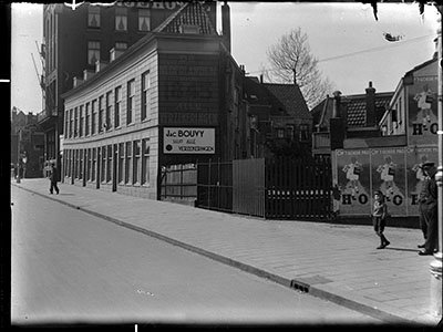 - Bebouwing aan de westkant van de Johan de Wittstraat tussen Bagijnhof en Vest. Het hoge gebouw is het Oranjehotel op de hoek van de Vest. Achter het hek de gedempte binnengracht / brandgang ‘het achterommetje’.