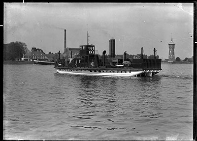 - Veerdienst VII op de Oude Maas richting Zwijndrecht. De fabriekspijp is van flessenfabriek Bottleworks en rechts de watertoren.