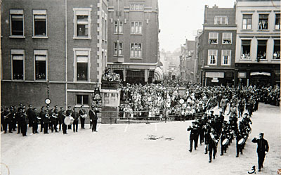 - Het Stadhuisplein waar tijdens de landdag de Bijzondere Vrijwillige Landstorm langs marcheert, voorafgegaan door de marinierskapel. Een muziekkorps van de politie staat links opgesteld.