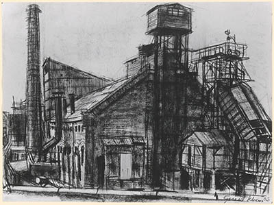Aquarel door Gerrit Kloens van de gasfabriek aan de Riedijk.