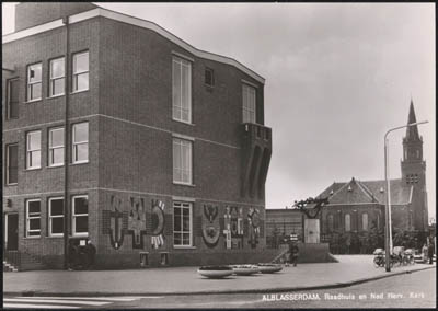 - Het gemeentehuis en de Grote Kerk aan het Cortgene in Alblasserdam.