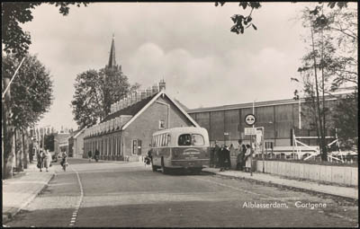 - Rechts de arbeiderswoningen van personeel van "de oude Werf" aan het Cortgene in Alblasserdam. De Grote Kerk op de achtergrond.