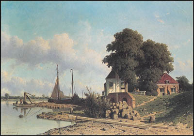 - Schilderij door Jan Weissenbruch van het Waardhuis van de Overwaard en de Elshoutsluis aan de Molenstraat in Kinderdijk.