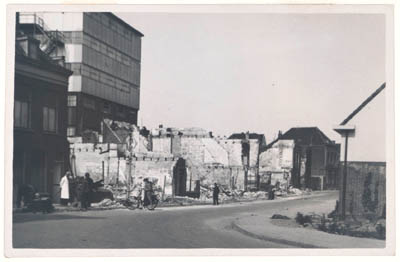 - Oorlogsschade aan Twintighuizen, gezien vanaf de Hoogt. Het gebouw is fabriek Victoria.