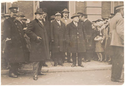- Ontvangst van Charles Benoist, gevolmachtigd minister en buitengewoon gezant van de Franse Republiek te 's-Gravenhage, voor een bezoek aan Dordrecht. Wethouder Stoop met de hand in de zak. Pal rechts van hem de heer Henri de Sauvage Nolting in zijn functie van consulair agent voor Frankrijk. Rechts van Benoist is stationschef Marx.