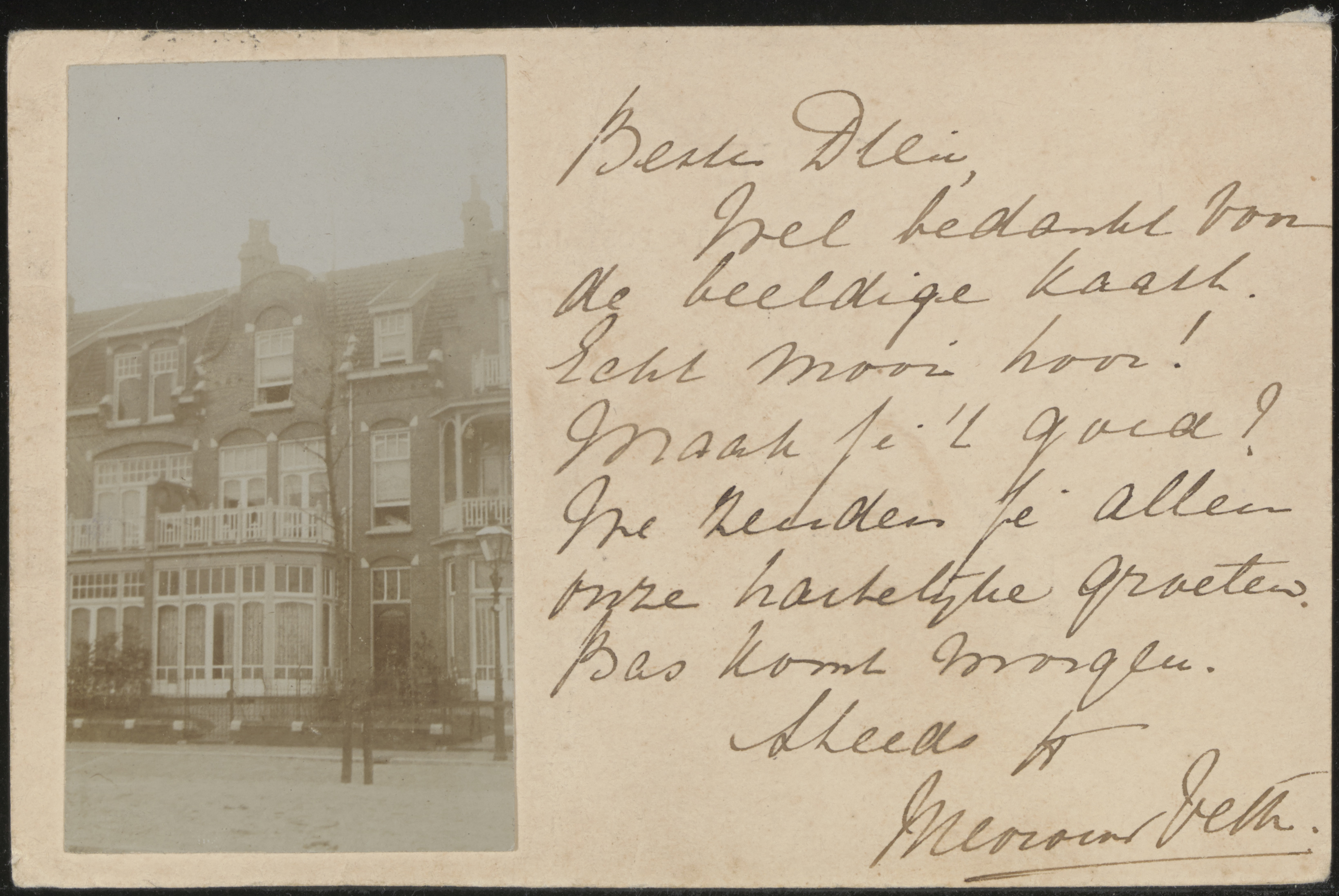 Graag gedaan, hoor, het is het uitzicht vanuit de slaapkamer van moeder. Ze denkt nog vaak terug aan onze lange zomers op Schouwen. Hier gaat alles goed en Vicky geneest goed. Doe de hartelijke groeten aan Bas en we zien elkaar snel. Groetjes, Dien