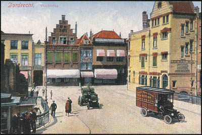 - De Visbrug vanaf de Voorstraat naar de Groenmarkt. Het pand met de trapgevel is De Vergulde Os.