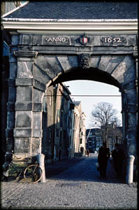 - De Catrijnepoort vanaf de Hooikade naar de Korte Engelenburgerkade en de Houttuinen. Links de pakhuizen Rusland en Engeland.