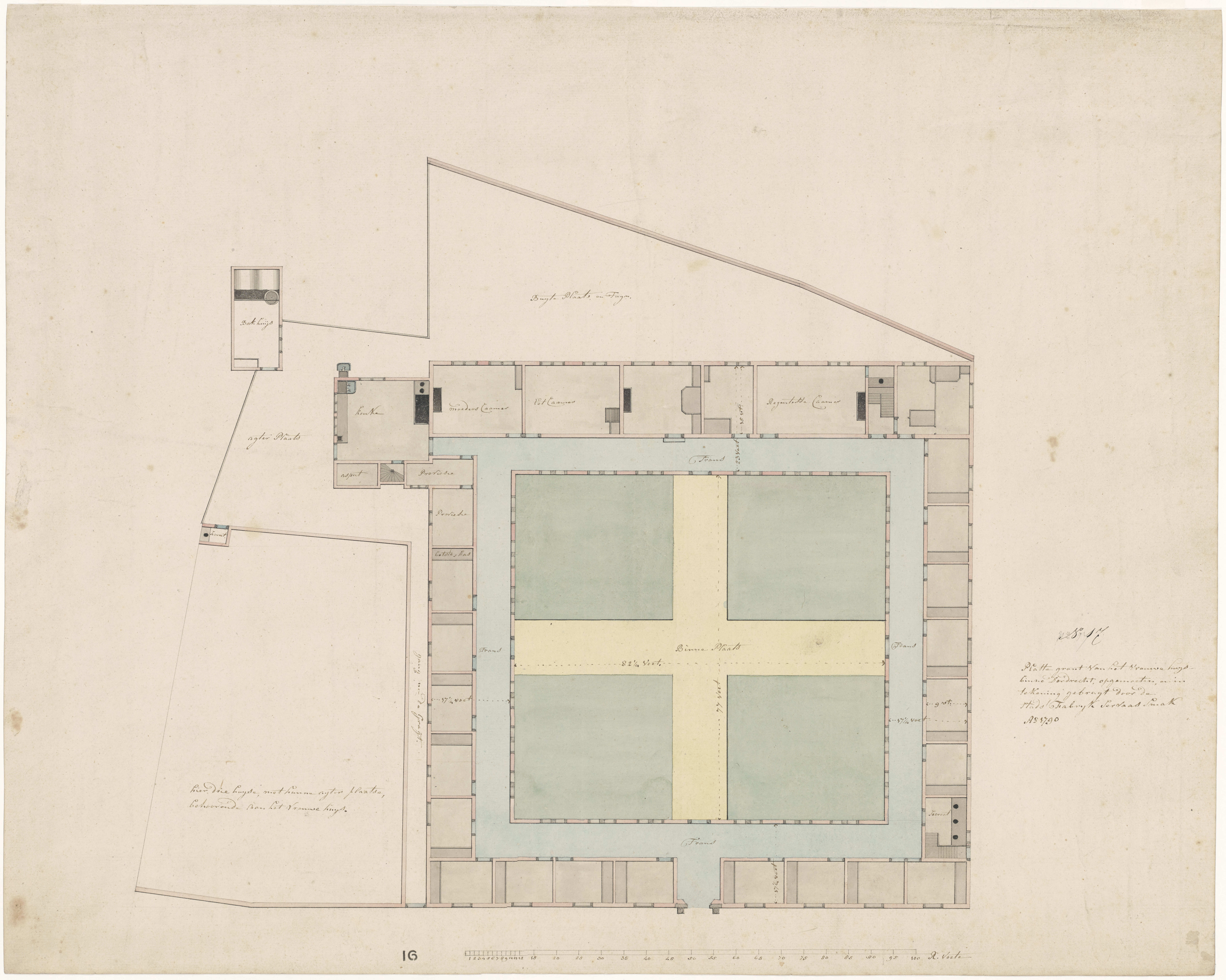 Wel gezellig zo'n secreet :)) Drie op een rij. In 1860 kapten ze alles links van de poort weg t.b.v. de bouw van een gemeenteschool. Zie 552_400075. Het heeft van 1625 tot 1799 als Vrouwe Huys dienst gedaan, daarna nog als kazerne, soepkokerij en in 1840 deels ingericht als bewaarschool. Wat stelt het blauw ingekleurde vierkant in de tekening voor Jeroen? Ik lees daar 'Frans'?