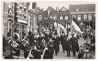 - hofpoortjes muziekkorpsen optochten publiek / toeschouwers vlaggen(stokken)