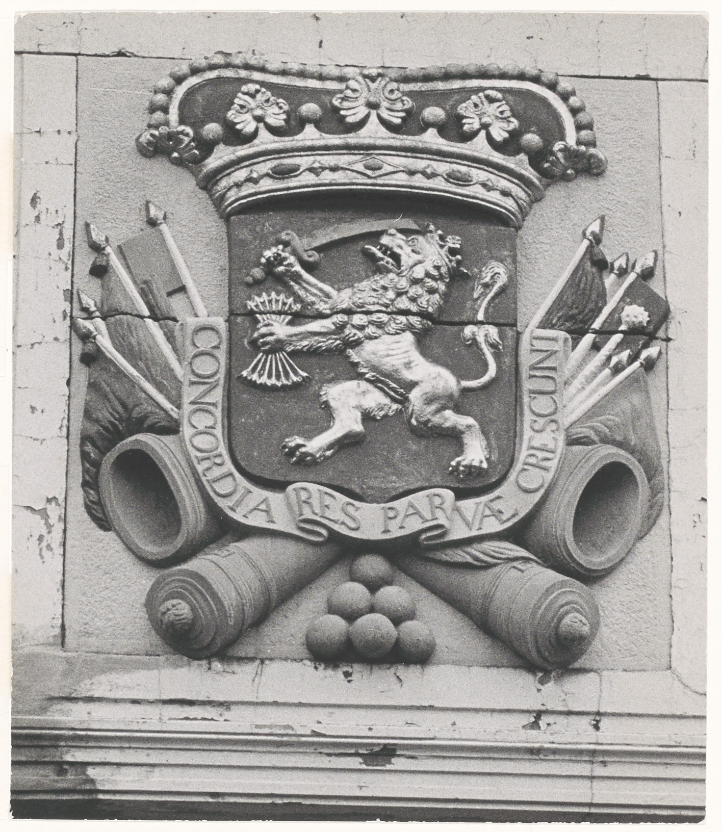 gevelsteen met leeuw op wapenschild 'Concordia res Parvae Crescunt' (Eendracht maakt macht)