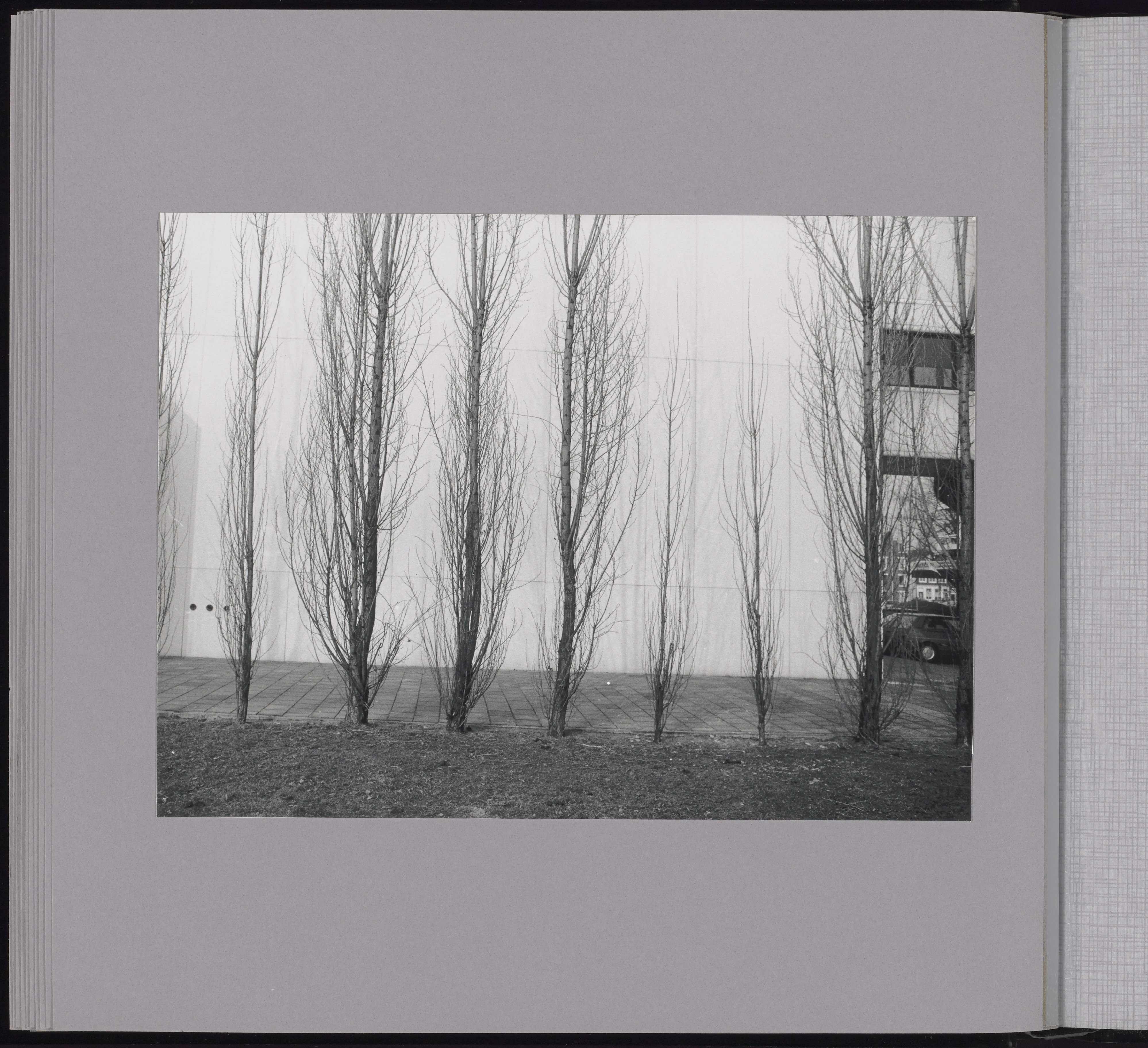 Kopse kant van oostelijke vleugel van stadskantoor, gezien richting de Boogjes. Rechts een stukje van de luchtbrug/loopbrug over de Hellingen. Grofweg 1967-1992, zal rond 1980 zijn?
