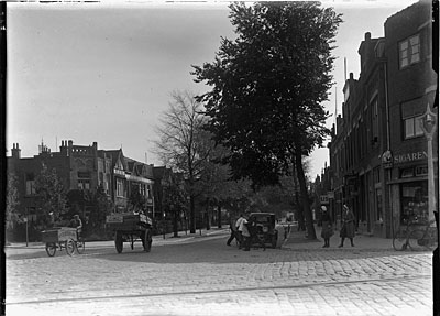 - auto's bakfietsen handkarren rookwaren / sigarenhandels spoorrails voetgangers