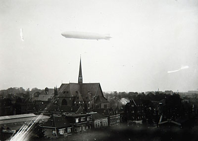 - De eerste zeppelin zie boven Dordrecht zichtbaar was. De foto is genomen vanaf het station in noordoostelijke richting van de R.K. kerk aan de Burgemeester de Raadtsingel.