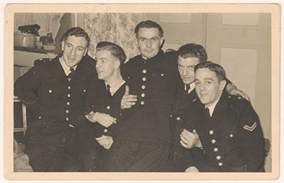 Groepsportret van 5 politieagenten op de trouwdag van één van hen (Stehouwer). V.l.n.r. …
