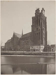 Gezicht op de Grote Kerk over het Maartensgat.