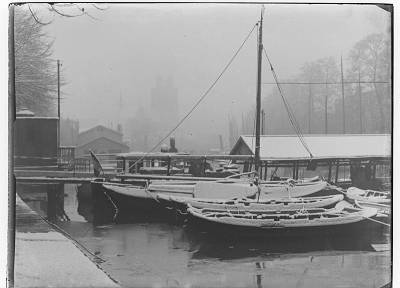 - Nieuwe Haven in de winter door de mist nog net de Grote Kerk zichtbaar