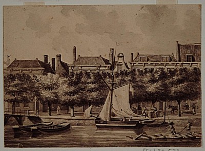 De Nieuwe Haven met links, gedeeltelijk zichtbaar, de Lange Houtenbrug; rechts een …