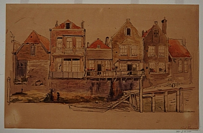 - Kalkhaven, de achterzijde van huizen aan de Kleine Kalkstraat; rechts de opgang naar de Sluisbrug, gezien vanaf Achterhakkers; anno 1904