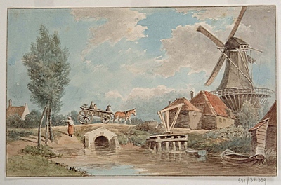 - hxb: 27,5 x 32,4 cm. Naar zijn olieverfstudie. Deze molen is gesloopt in 1861 en vervangen door de stoom-olieslagerij De Haas; later kwam op die plaats het gemeentelijk stoomgemaal.