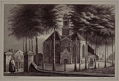 - St. Nicolaas- of Nieuwe Kerk met kerkhofmuur, ca. 1860, gezien vanuit de Nieuwkerkstraat.
